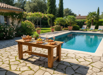 Masívny stôl vyrobený z recyklovaného starého dreva o rozmeroch 180 x 90 cm a výške 78 cm. Hrúbka vrchnej dosky je 4 cm. Nohy sú z hranolov 17 x 17 cm. Podstavu tvorí robustná konštrukcia, na ktorú je uchytená vrchná doska.